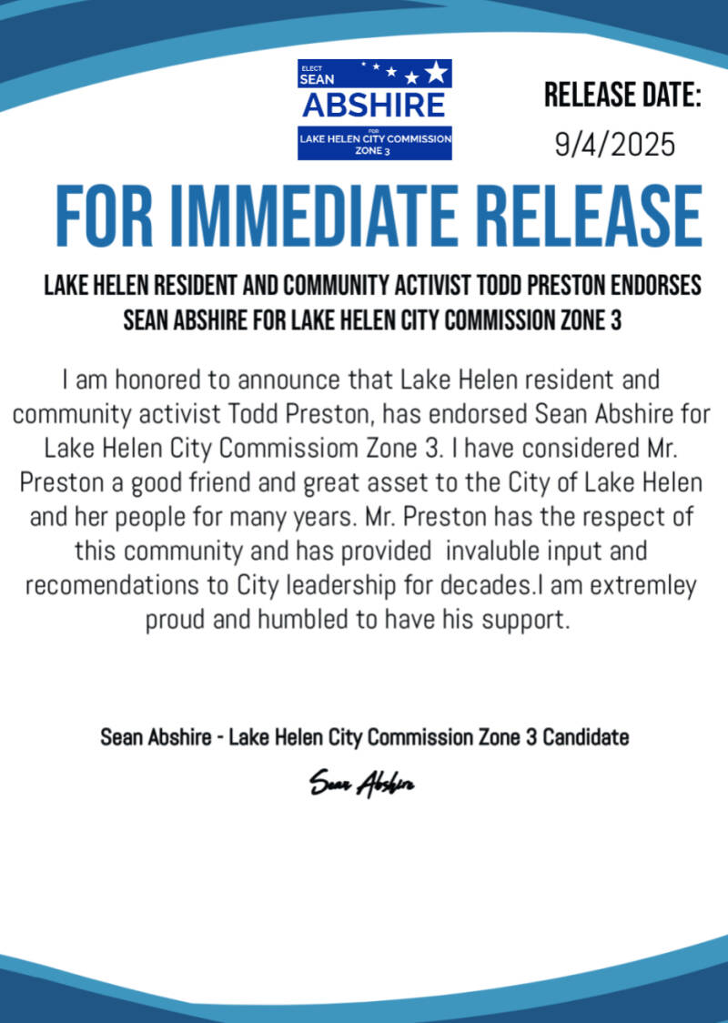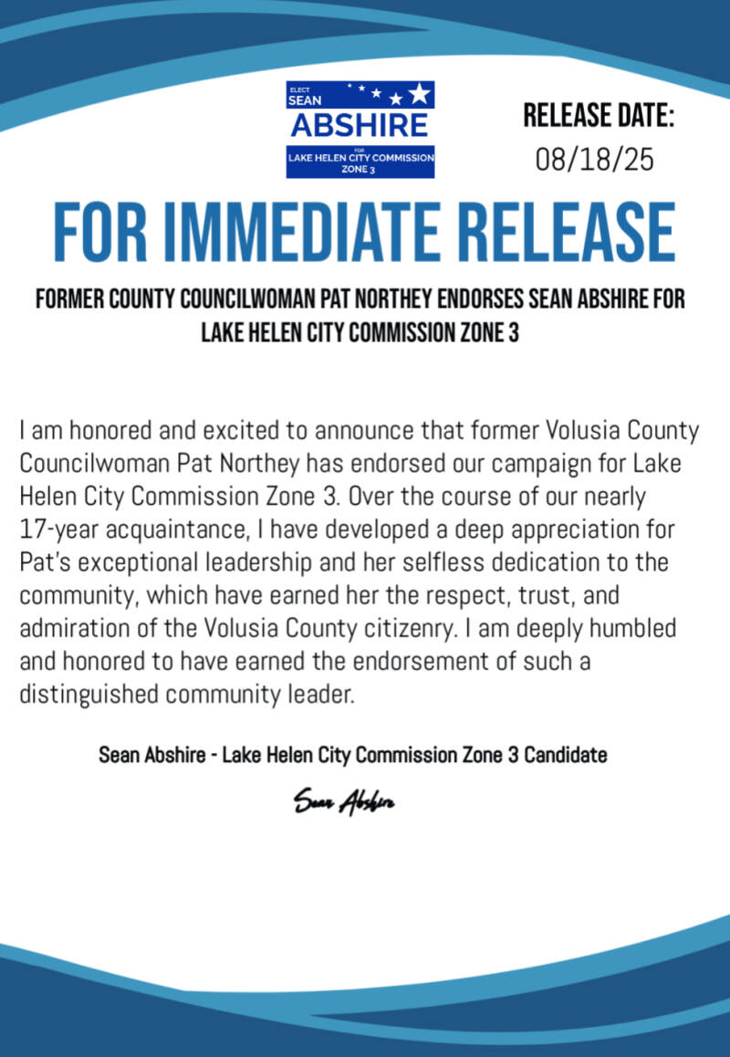 FORMER COUNTY COUNCILWOMAN PAT NORTHEY ENDORSES SEAN ABSHIRE FOR LAKE HELEN CITY COMMISSION ZONE 3